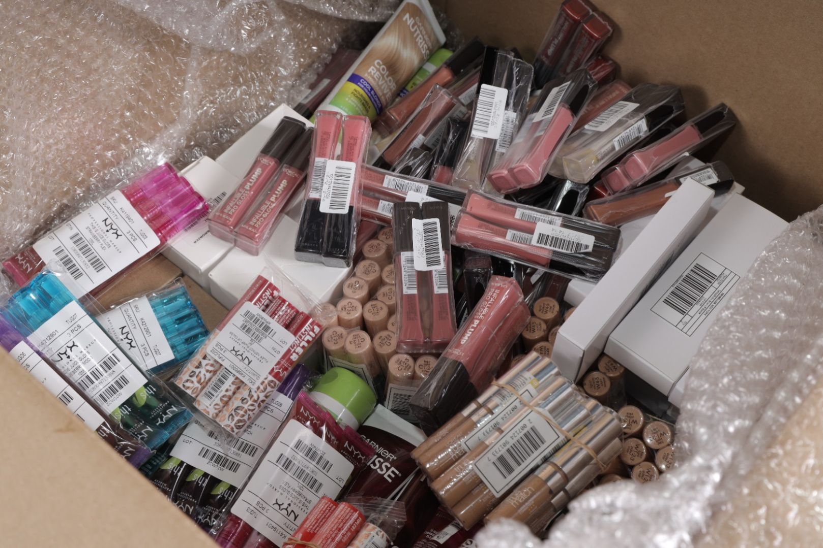 Caja surtida de 250 unidades de cosméticos nuevos en sobrestock de L'Oréal, NYX y Maybelline. Parcialmente manifestado.