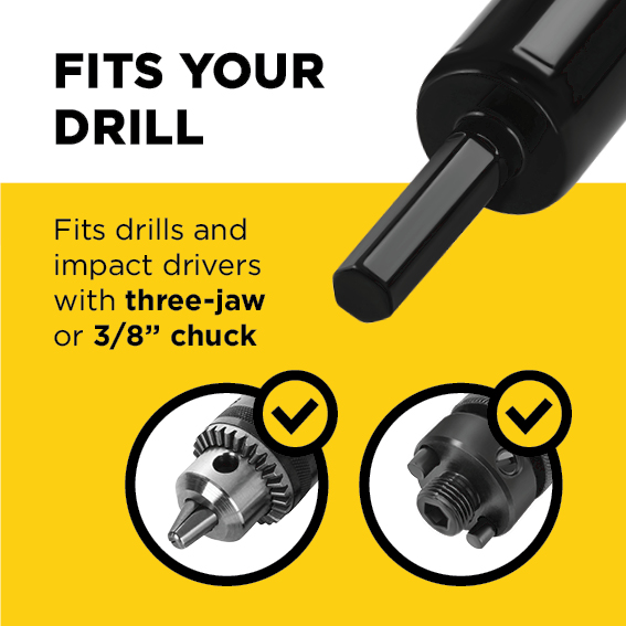 - FUNCIONA CON CUALQUIER TALADRO Compatible con mandriles de tres mordazas o hexagonales (3/8” o mayores), taladros de impacto o percutores. Se recomienda usar taladros de 14V o más y velocidad baja para mayor seguridad.