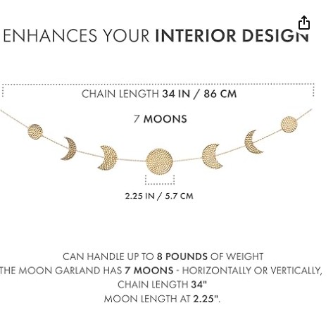 - Cada Detalle Importa - Incluye 7 lunas doradas, empacadas en una caja artesanal de papel y una bolsa de lino puro. Longitud total: 34''. Cada luna mide aprox. 2.23'' colgando hasta 2''. Cada pieza luce única y hermosa en tu pared