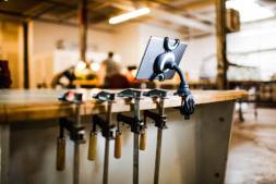 The Clamp unfolds and ratchets into place. Its rubber pads protect your furniture while securing your device.