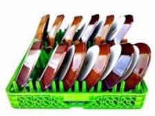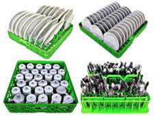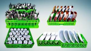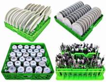 This liquidation is for 709 sets Cloracks commercial dishwashing racks. Each set of dish racks includes 3 utensil caddies, 1 multipurpose tray (holds 3 utensil caddies), 1 multipurpose tray for large utensils, 1 small plate tray, 1 cup tray, 1 large bowl tray, 1 large plate tray, 1 tray for large glasses, 1 tray for regular size plates.