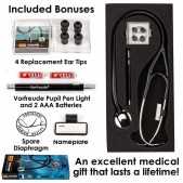 Included bonuses: replacement ear tips, diaphragm, free name plate, and free pupil training light and batteries.