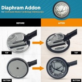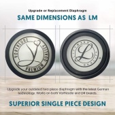 Fits all master cardiology and more – 45mm inside diaphragm diameter and 50mm outside retainer ring diameter. Diaphragm is built in to retainer ring so they will not separate in use.